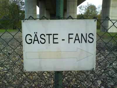 Das "Stadion" in Koblenz; unten: ein Einheimischer mit "Scheiss-TuS"-Schal, der mit seinen Kumpelz bei allen TuS-Heimspielen die Gäste supportet